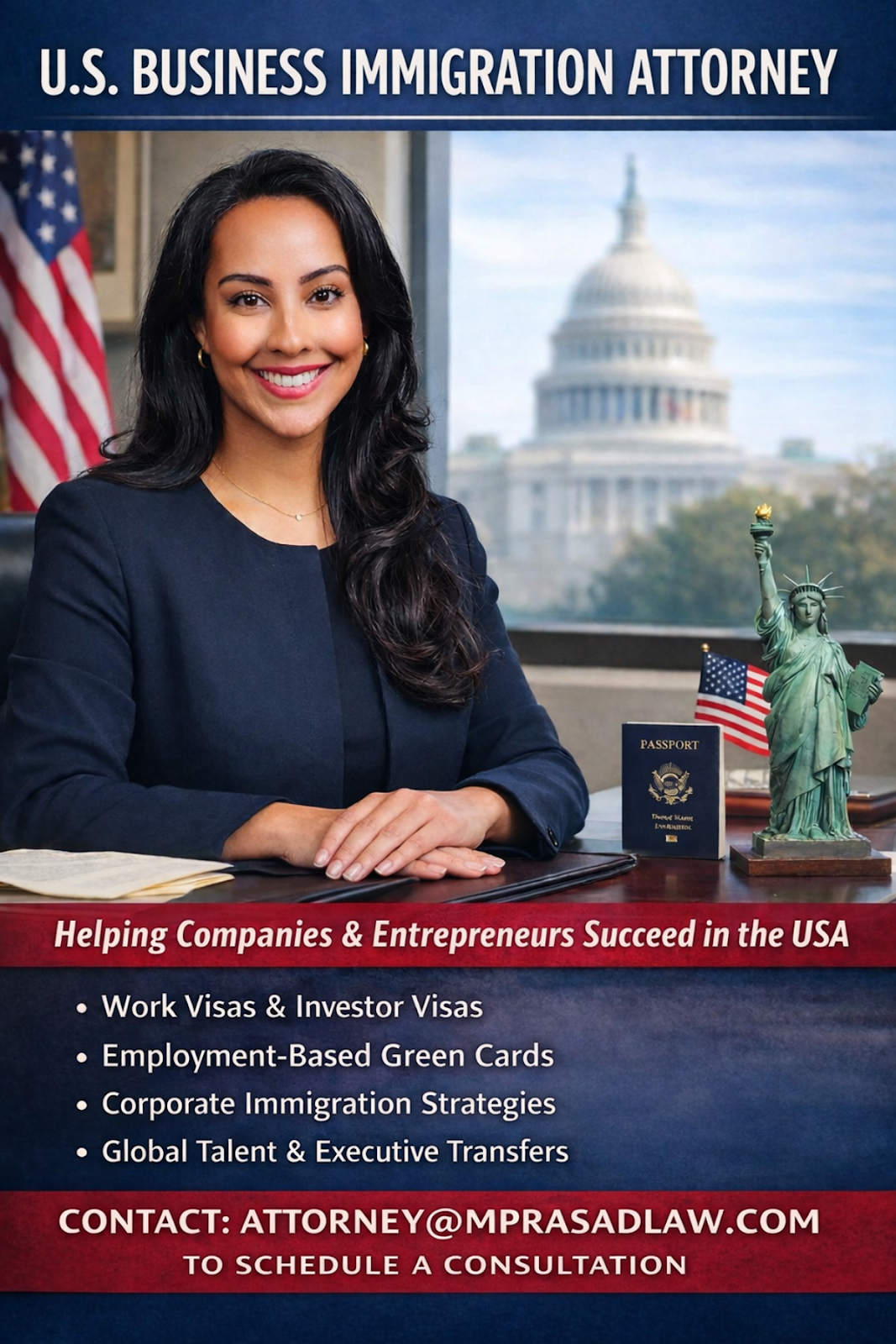 Whether you’re a business owner in need of foreign talent or an international professional seeking to work in the U.S., The Law Office of Michelle Prasad, PLLC is here to help. With Michelle’s expert guidance, you can confidently navigate the immigration process and secure the talent that will drive your business forward.